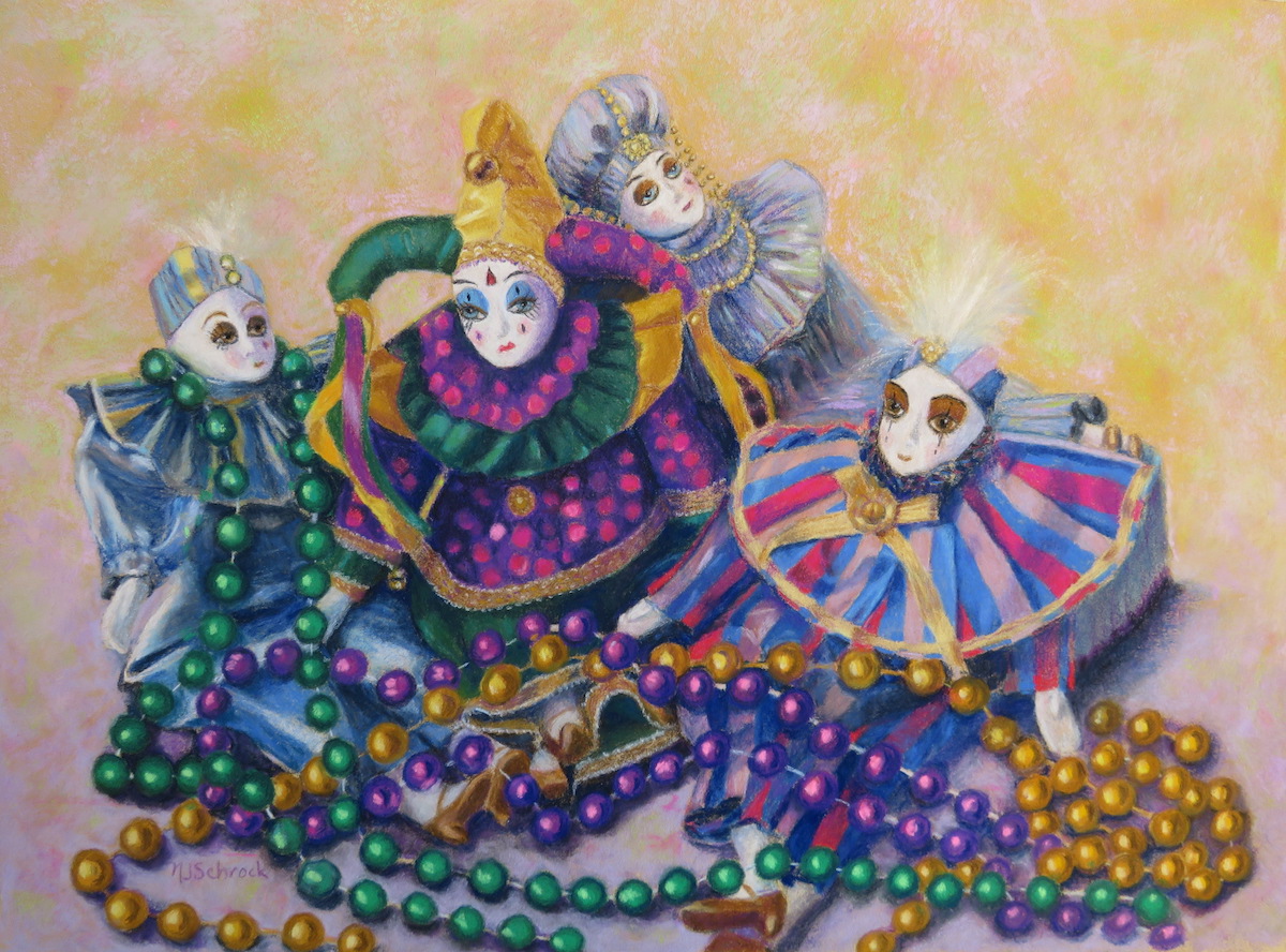 Spa Time (below, top right, pastel) won First Place in the Pastel Society of New Mexico’s All Members’ Show at Weems Gallery in November 2023. Mardi Gras Girls, (top left, pastel) won an Honorable Mention in the same show.