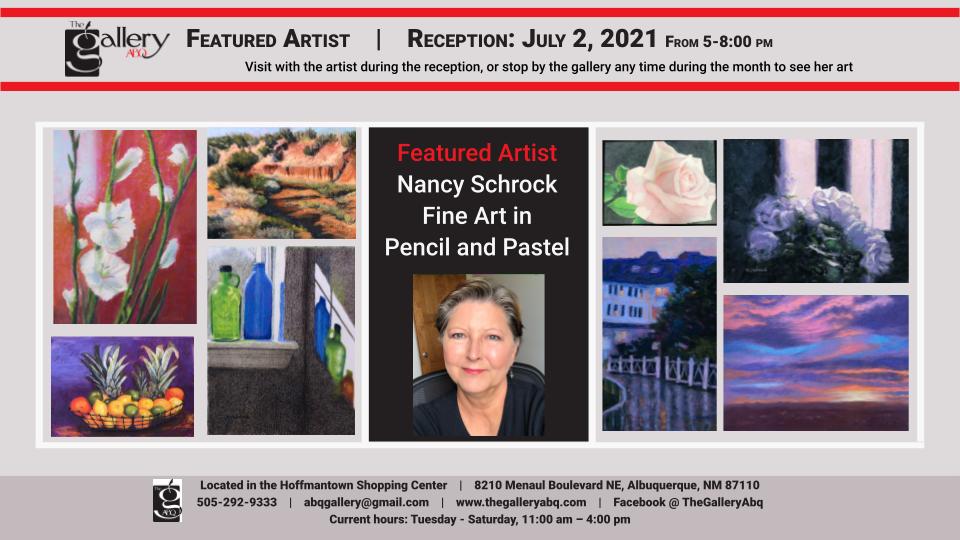 I am the Featured Artists at The Gallery ABQ for the month of July. Mark Serafin is in the salon. Stop by and see the art!