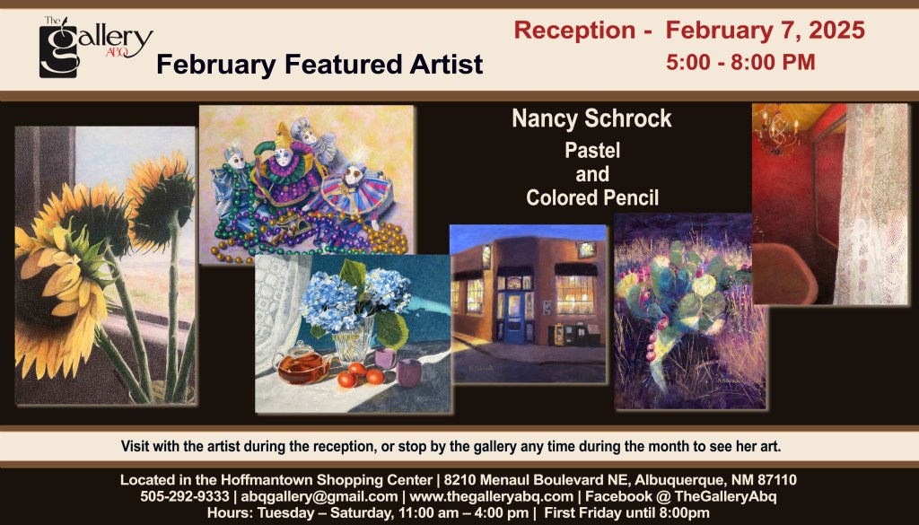 Friday, February 4, 2022, I will be at the ArtsCrawl First Friday event at The Gallery ABQ in Albuquerque. Come join us and enjoy a night of art. I have two pastels in the salon show: Share the Love!